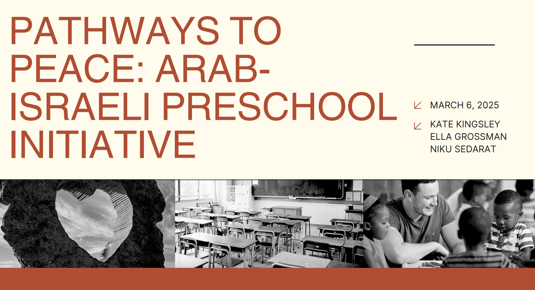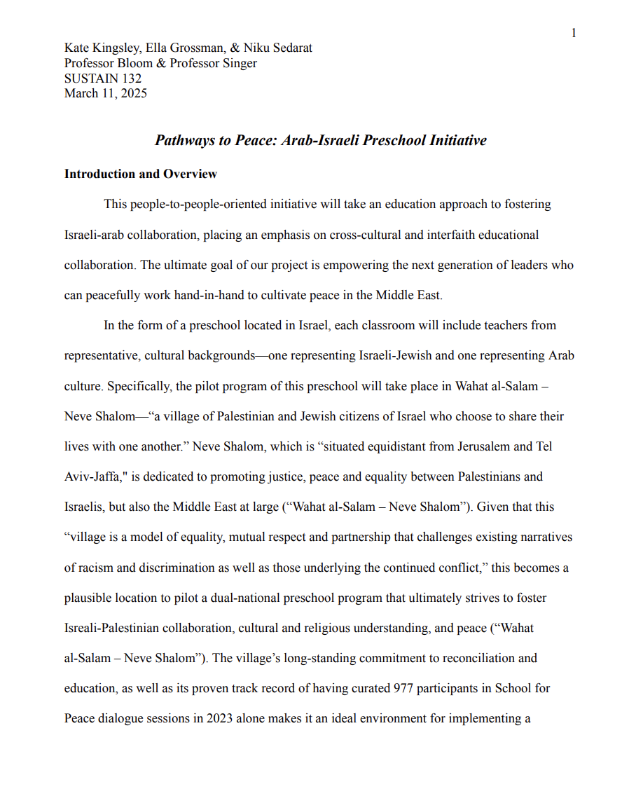 Upon direction within a class to develop a human to human pathway to peace within Israel and Palestine, my pre-assigned group concluded developing a preschool initiative as the most impactful way for peace within human relations.