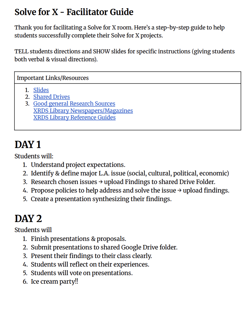 Previously, Solve for X was a singular day afternoon endeavor. Through my interviews and in depth research, I was able to help develop and establish an expanded two day curriculum still in practice today.